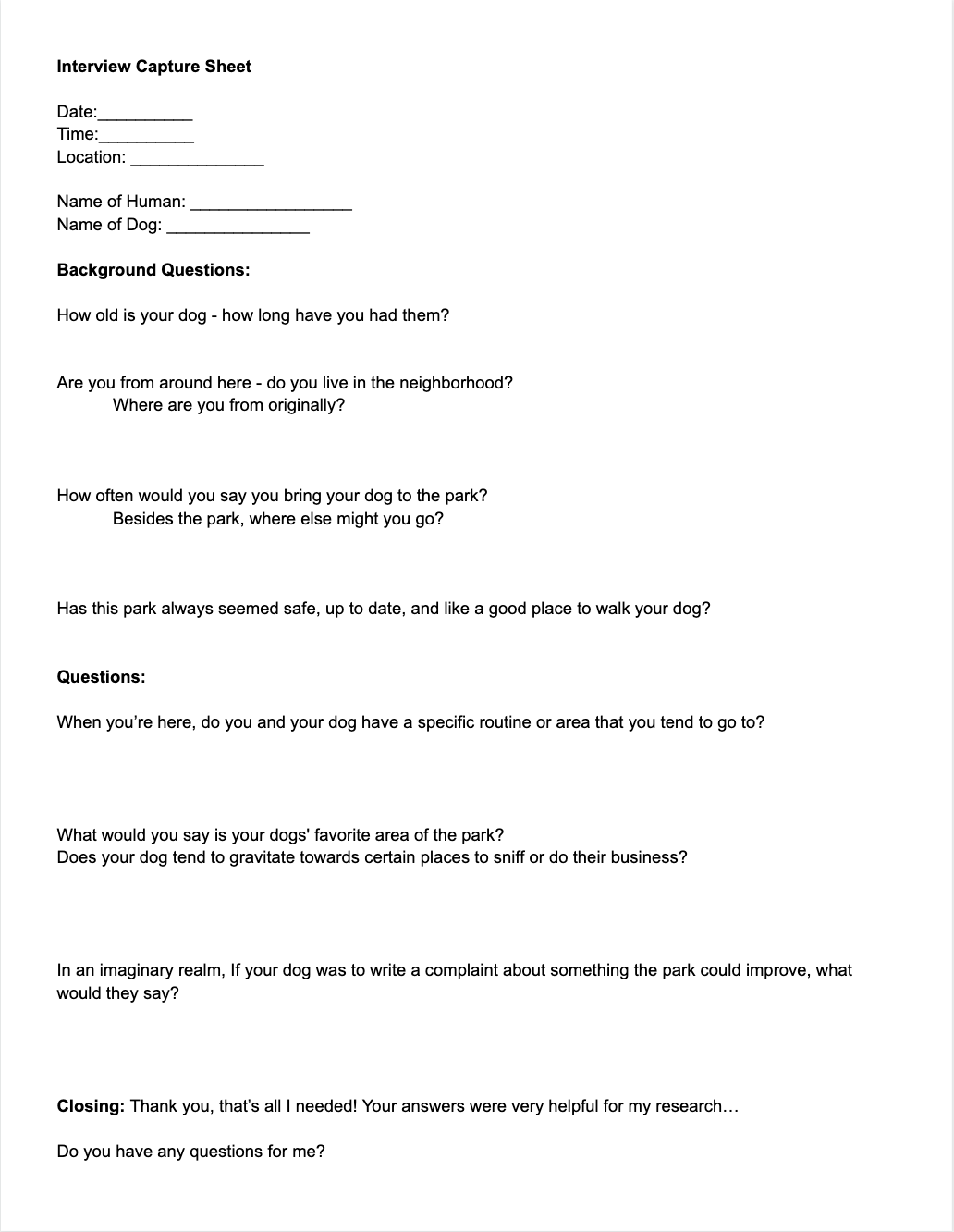 After discovering the initial problem surrounding dog owners, I began conducting interviews to get a better perspective on whether other people have made similar observations to my own. I asked questions like if they had a special routine with their dog or if they knew their favorite part of the park.